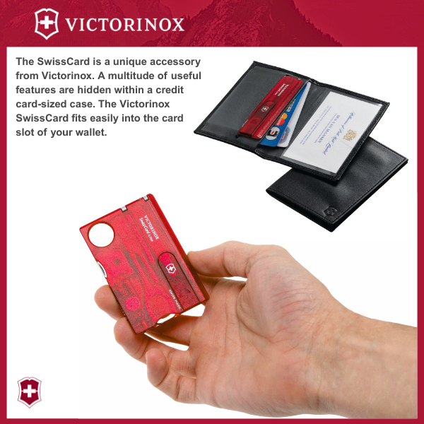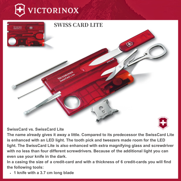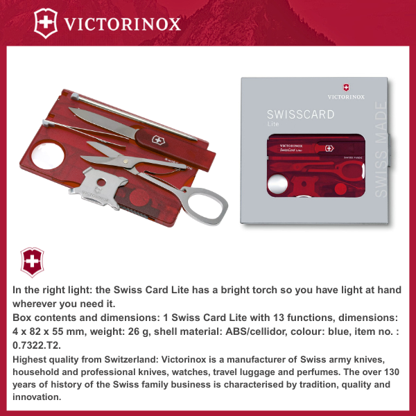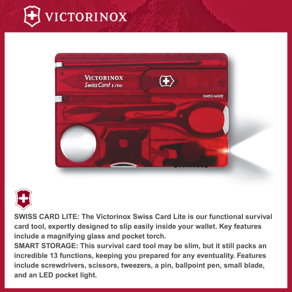 SWISS CARD LITE: The Victorinox Swiss Card Lite is our functional survival card tool, expertly designed to slip easily inside your wallet. Key features include a magnifying glass and pocket torch